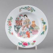 Europees porseleinen ruby back bord met famille rose decor van een lange lijs met vier zotjes bij vazen en tafel, vermoedelijk Samson, 19e eeuw -randchipjes-, Ø 24 cm, verso met papieren label: 'From the Sneyd heirlooms, Keele Hall', het label lijkt een verwijzing naar de veiling van Christie's, Londen, 26 juni 1924: 'Old English & French furniture and objects of art being a portion of the Sneyd Heirlooms, Removed from Keele Hall’, waarin lot 44 omschreven staat als: 'Five famille-rose dishes, enameld with ladies and boys in the centre, and flower-sprays round the border on white ground, with ruby-backs--9 1/2 in. diam.--Kien-Lung', eenzelfde bord bevindt zich in de collectie van het museum Petit-Palais in Parijs, afkomstig uit het legaat uit 1902 van Eugène en Auguste Dutuit