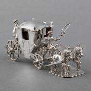 Zilveren miniatuur: koets met tweespan, twee figuren, menner en palfrenier meester: Arnoldus van Geffen, Amsterdam, 1747, gewicht 161 gram, lengte 11 cm