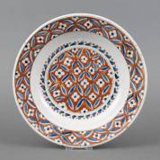 Diep aardewerk bord met rood-blauw geometrisch bloemdecor, Iznik, vroeg 17e eeuw -ophanggaatjes, chip van standring-, Ø 27,3 cm