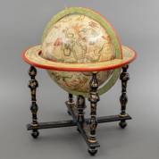 Franse hemelglobe door Louis Charles Desnos (1725-1805), 'Globe Celeste Dressé suivant les nouvelles observation de messieurs de l'Aca.e Royalle des sciences par Desnos 1753', staand op een zwartgelakte houten stoel met verguld floraal decor -schaalplaat op de meridiaanring en de messing uurring ontbreken, opnieuw gevernist en roodgelakt-, 57 × 45 cm