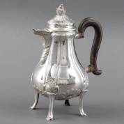 BWZG peervormige chocoladekan met houten greep, op vier hoge pootjes, gedecoreerd met rocailles en schelpmotieven, het deksel met afschroefbare dop voor de roerstaaf, gemerkt met pseudokeuren, brutogewicht 1088 gram, 31 × 20 × Ø 15 cm