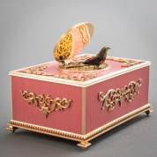 14kt gouden automaton met zingend vogeltje, de doos staand op vier pootjes en gedecoreerd met roze- en wit email en gouden rocaille-appliques, in stijl van Fabergé, gemerkt CB, Rusland, gewicht 690 gram, 5 × 10,5 × 5,5 cm, in Fabergé doos -vogeltje moet beetje worden geholpen om omhoog te komen-